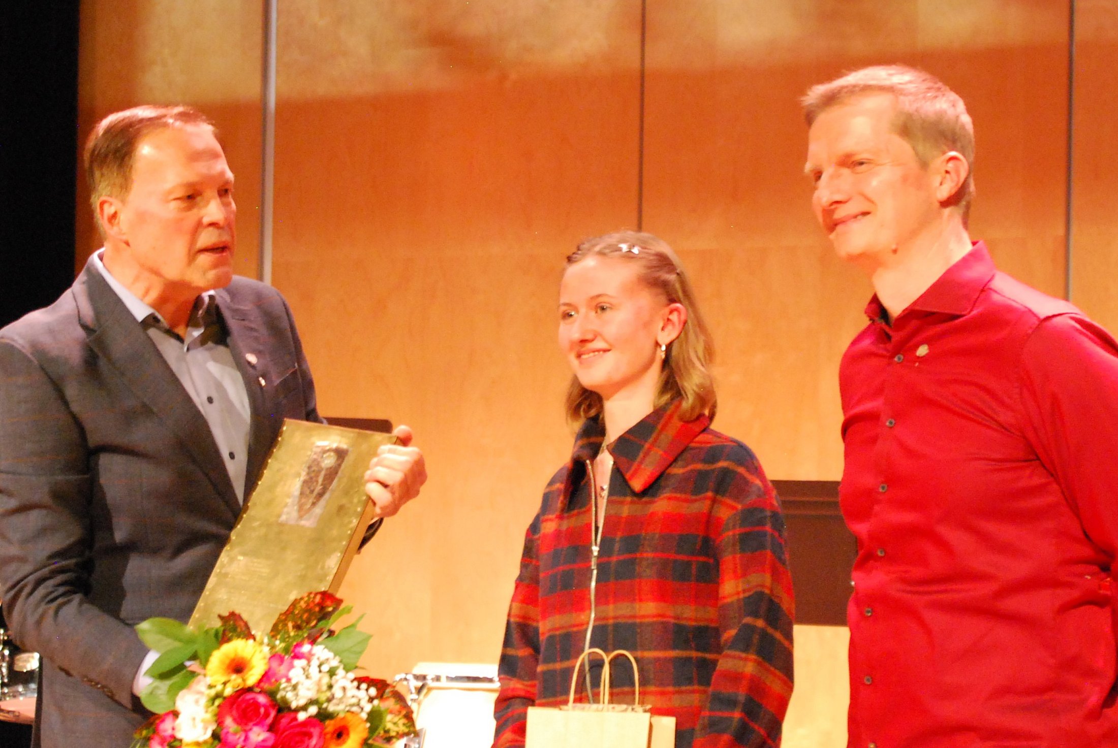 Nathalie May ist die diesjährige Preisträgerin der "Rose des KHG". Die Schülerin der Q13 wurde während des zweiten Weihnachtskonzerts am 17. Dezember mit dem Ehrenpreis der Schule ausgezeichnet. Die Preisträger des letzten Jahres, Herr Gruber und Herr Riedel, hoben das unermüdliche und vielfältige Engagement der Schülerin hervor, sei es als Mitglied des Technik-Teams, als Medienscout, Mitglied der Kritiker-Society oder Musikerin - um nur einige Bereiche zu nennen. Mit unerschöpflicher Ausdauer, Gelassenheit und Humor engagiere sie sich von früh bis spät für das KHG und habe sich daher für den Ehrenpreis qualifiziert, der herausragende Persönlichkeiten unserer Schule auszeichnet. Wir gratulieren!