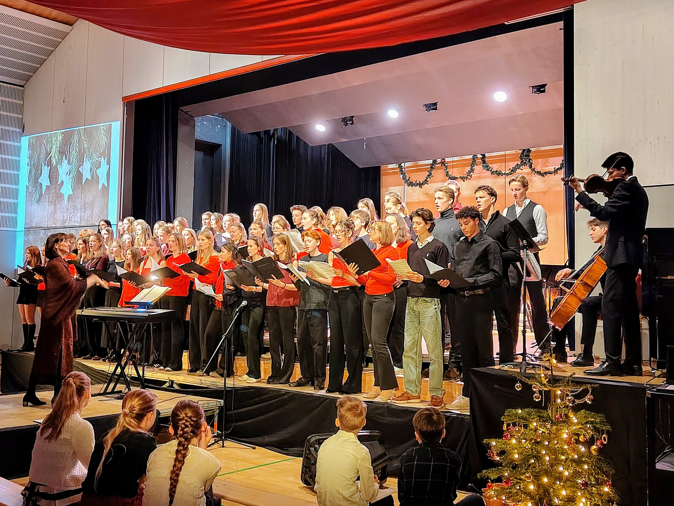 Die beiden Weihnachtskonzerte am Dienstag, 16. und Mittwoch, 17. Dezember 2025 zeigten auch dieses Jahr die große Freude von sehr vielen Schülerinnen und Schülern aller Jahrgangsstufen am Singen und Musizieren. Das hohe musikalische Niveau und die erstaunliche Vielfalt der Darbietungen wurden an beiden Abenden vom Publikum mit jubelndem Applaus gewürdigt. Ein herzlicher Dank an die drei Musiklehrerinnen, Frau Heindl, Frau Leininger und Frau Schlicht, wurde von Herrn Rosa als Vertreter des Elternbeirats und der gesamten Elternschaft ausgesprochen.